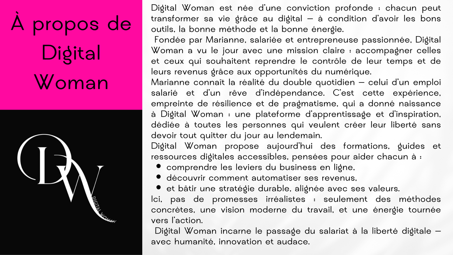 Fondée par Marianne, salariée et entrepreneuse passionnée, Digital Woman a vu le jour avec une mission claire : accompagner celles et ceux qui souhaitent reprendre le contrôle de leur temps et de leurs revenus grâce aux opportunités du numérique.