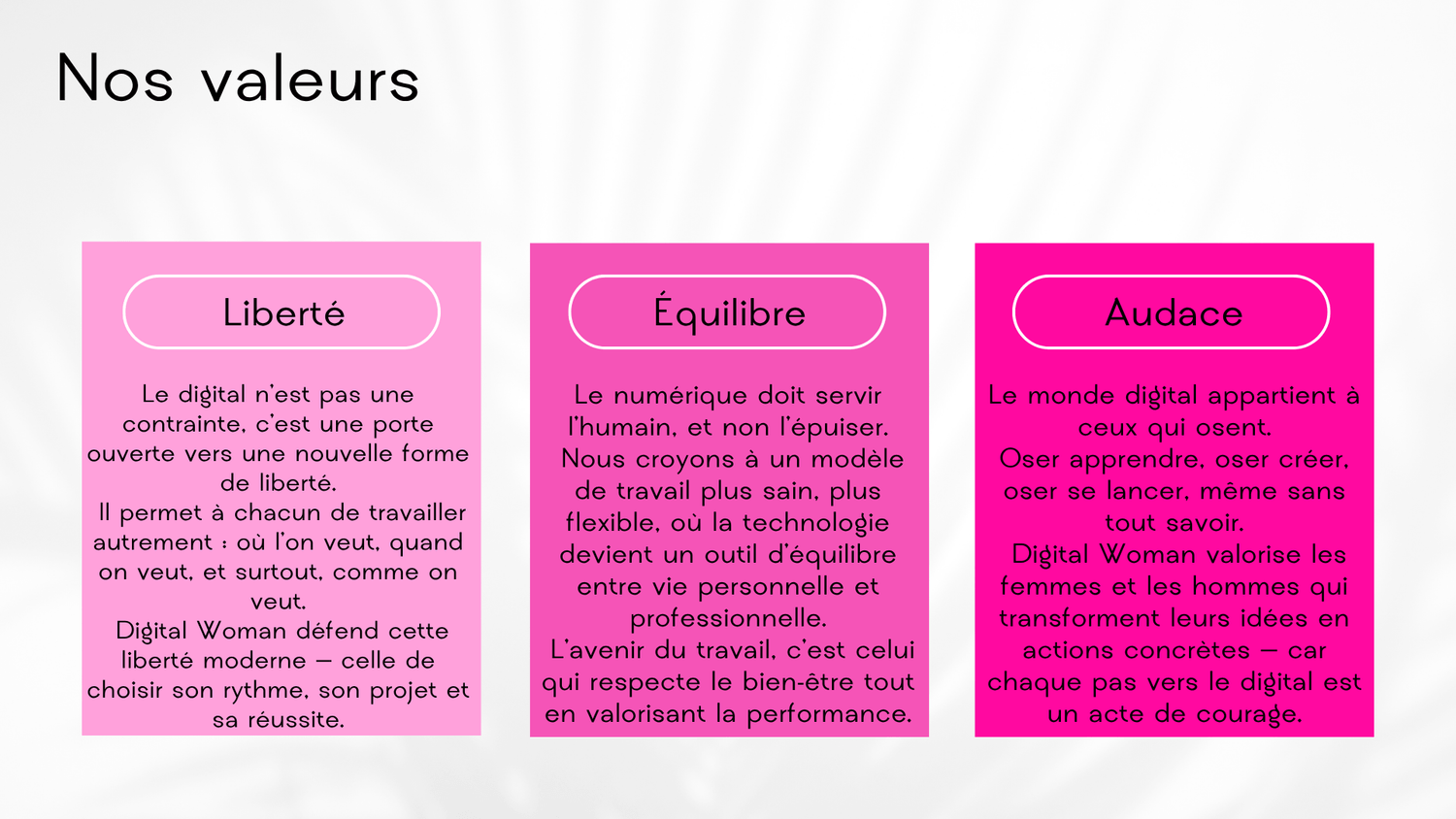 C’est cette expérience, empreinte de résilience et de pragmatisme, qui a donné naissance à Digital Woman : une plateforme d’apprentissage et d’inspiration, dédiée à toutes les personnes qui veulent créer leur liberté sans devoir tout quitter du jour au lendemain.